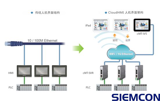 CloudHMI——云端人机界面,超越了传统HMI的架构,将人机界面分离为服务器和触控显示器。cMT-SVR服务器如纤小的盒子却有着广泛的兼容适用性,能与PLC控制器连接并执行运算功能;